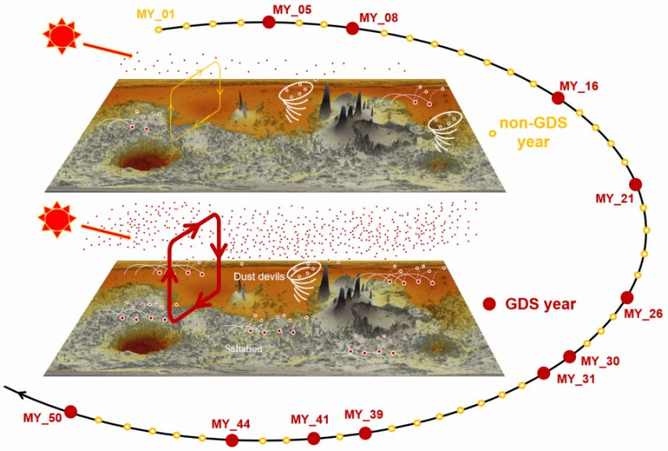 △正在GoMars的50年模仿中产生的11次寰球性沙尘暴,和沙尘轮回的相干体制。 (总台央瞅记者 帅俏齐 褚我嘉)